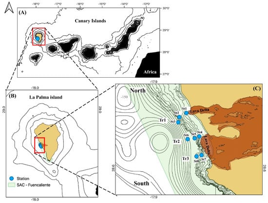 Study area off La Palma Island (Canary Islands), showing the location of transects and sampling stations: (A) geographic location of the Canary Islands; (B) detailed view of La Palma Island, including the SAC (in green); and (C) distribution of sampling stations (blue dots) along coastal transects.