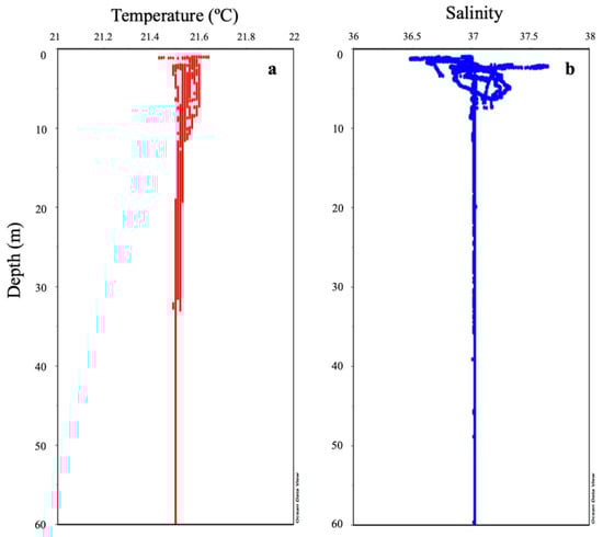 Vertical profiles of temperature and salinity (Figure 2) showed distinct patterns in the upper water column. In the first 10 m, both parameters observed variability: the temperature ranged from 21.4 to 21.7 °C, while the salinity fluctuated between 36.5 and 37.5. This heterogeneity could result from active ocean–atmosphere interactions, including wind mixing, evaporation, and localized precipitation, which can significantly influence surface water properties. Below this surface layer, the water column became increasingly homogeneous, with temperature and salinity stabilizing around mean values of 21.5 °C (±0.006 SE) and 37 (±0.021 SE), respectively.