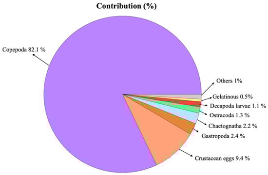 Other contributing groups, including gastropods, chaetognaths, and ostracods, showed relative abundances consistent with prior studies across these subtropical waters [,,,]. Similarly, total biomass values matched historical records from both coastal [] as well as other oceanic areas within the archipelago [,,].