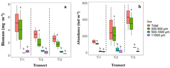 Boxplots of (a) zooplankton biomass (mg dry weight·m-³) and (b) abundance (ind·m-³) across transects (Tr1−Tr3) and size fractions (200−500, 500−1000, and >1000 µm). The “Total” category represents the sum across all size fractions. Letters above boxes indicate significant differences between size fractions within each transect based on Tukey’s HSD post hoc test (p < 0.05).