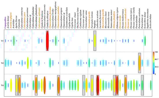 The dominance of specific taxa was more pronounced in Tr1, where certain species (e.g., Candacia ethiopica) appeared in high abundance (red zones in the heatmap), potentially indicating localized blooms or opportunistic responses to recent environmental disturbances. In contrast, Tr2 presented a more balanced community structure, with intermediate levels of abundance across multiple taxa. Tr3 exhibited the highest diversity, with several species showing elevated relative abundance, including Lubbockia aculeta, Oithona setigera typica, and Oncaea scottodicarloi). This trend suggests a shift toward a more stable and structured zooplankton community, potentially influenced by more favourable environmental conditions or reduced impact from recent perturbations.
