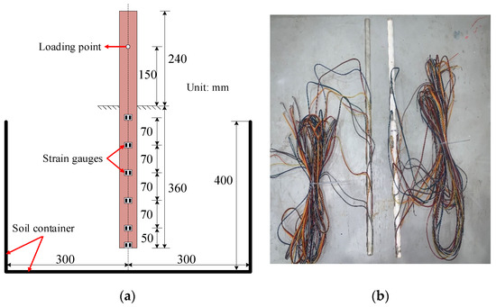 There are six pairs of strain gauges (see Figure 2a) pasted on the pile shaft to calculate the bending moment along the pile; the resistance of the strain gauge is 120 Ω. All the strain gauges were arranged below the ground surface. The static strain measuring instrument was used to collect strain data, with a measuring range of 0~±38,000 με. The wires of the strain gauge were connected to the static strain measuring instrument by a 1/4 Wheatstone bridge.
