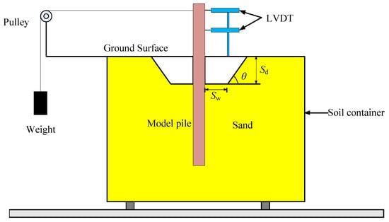 The loading device mainly consists of a soil container, a moving pulley, an LVDT, a weight, and a wire rope, as shown in Figure 3. Three factors are involved in a typical local scour pit around the pile foundation: the scour width (Sw), scour depth (Sd), and scour slope (θ). The general scour is a special local scour as the slope (θ) is 0°. The steel wire rope can apply a lateral load on the model pile through a pulley. It should be noted that in order to avoid the boundary effect, the distance between the side wall and pile should be larger than 6D (D is the diameter of the pile) [23,24]. The formation of the scour pit was realized by hand in the test, and the sand was evenly poured into the soil container; when the sand accumulated to a certain thickness, the sand was compacted, and the relative density of the sand was controlled to 60%.