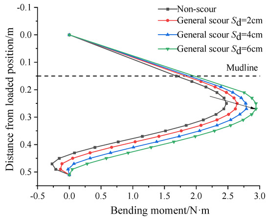 Figure 8 shows the bending moment distribution of the pile at different depths under local scour, with the lateral load set at 12.54 N. It can be seen that the maximum bending moment increases with the scoured depth. When the local scour depth is 2 cm, 4 cm, and 6 cm, their maximum bending moment values are 4.27%, 9.36%, and 12.06% larger, respectively, compared to non-scour conditions. The levels of growth are less than those observed under general scour tests.