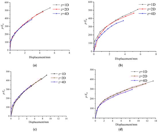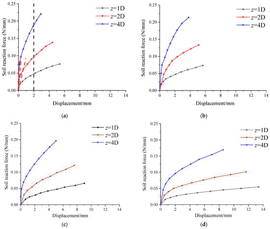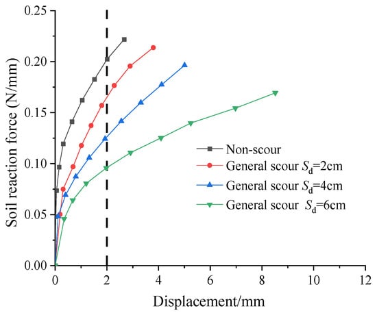 Figure 9 presents the p-y curves at different scour depths (under general scour). These curves generally exhibit a nonlinear distribution. The slope of the p-y curve increases with soil depth. For example, in Figure 9a, the initial slopes of soil at depths of 1D, 2D, and 4D below the surface are 0.11 N/mm2, 0.57 N/mm2, and 9.63 N/mm2, respectively. Correspondingly, the soil reaction force (p) increases with soil depth. When the displacement of the pile is 2 mm, the soil reaction forces (p) are 0.048 N/mm, 0.096 N/mm, and 0.188 N/mm at soil depths of 1D, 2D, and 4D below the surface, respectively. This is because the deeper the soil is below the surface, the heavier the upper soil, resulting in a greater soil reaction force.