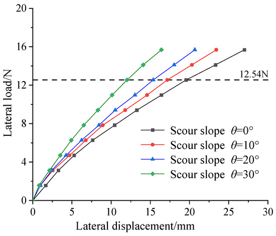 Figure 12 shows the displacement-load curves. It can be seen that the larger the scour slope, the greater the ability to resist deformation, and the stronger the pile foundation maintains its stability. When the lateral load is 12.54 N, the displacement at the loading point of the pile with a slope of 30° is 14.09 mm. When the slope is 20°, 10°, and 0°, the displacement is 122%, 136.79%, and 138.8% of that for the slope of 30°. Compared to scour depth, scour slope has less influence on the displacement growth rate.