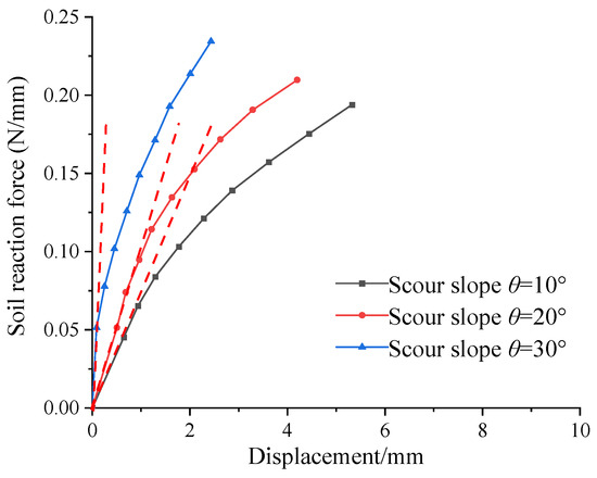Figure 14 shows the p-y curve under different scour slopes for 4D below the surface. It can be seen that at the same position below the surface, the initial slope of the p-y curve increases with the increase of the scour slope. The initial slope of the curve is 0.07 N/mm2 for a scour slope of 10°. The initial slopes of the curves are 0.11 N/mm2 and 0.57 N/mm2 for scour slopes of 20° and 30°, respectively. This is because the larger the scour slope, the more soil remains in the upper soil, resulting in a greater initial modulus of the soil.