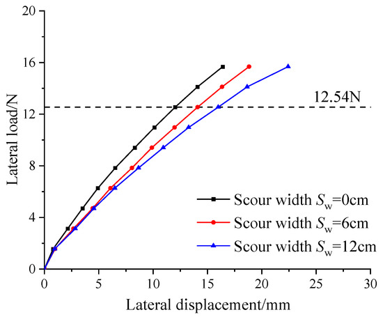 Figure 15 illustrates load-displacement curves for different scour widths. The displacement at the loading point of the pile increases with the increase of scour width, causing the lateral bearing capacity of the pile to continuously decrease. When the lateral load is 12.54 N, the displacement at the loading point of the pile with a scour width of 0 cm is 12.03 mm. When the scour widths are 6 cm and 12 cm, the corresponding displacements are 17.2% and 32.95% larger than that for the scour width of 0 cm, respectively. Meanwhile, compared to other scour factors such as depth and slope, the scour width has a lesser effect on the increased amplitude of the displacement.