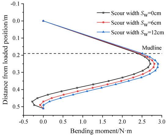 Figure 16 shows the bending moment distribution curve for different scour widths under a lateral load of 12.54 N. The bending moment of the pile increases with the increase of scour width under the same lateral load. For example, the maximum bending moment is 2.70 N·m when the scour width is 0 cm. The maximum bending moments for Sw = 6 cm and Sw = 12 cm are 2.81 N·m and 2.91 N·m, respectively, which are 4.07% and 7.40% larger than that for the scour width of 0 cm.