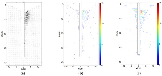 Deformation fields of pile-soil under local scour when Sd = 4 cm (F = 12.54 N). (a) Displacement vectors; (b) Positive strain contours; (c) Shear strain contours.