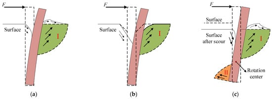 Diagram of lateral pile-soil deformation under different scouring conditions. (a) Non-scour; (b) Local scour; (c) General scour.