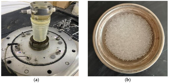 BE–RC joint test equipment: (a) Φ 50 × 100 mm testing specimen (Φ is the average diameter); (b) quartz glass beads with particle diameters of 2 mm.