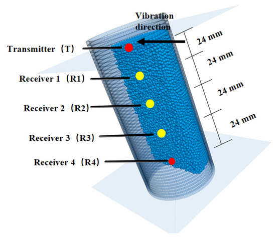 In the simulation, a point source was designated for the excitation of the shear wave, utilizing a sine wave as the excitation signal. The shear wave excitation was simulated by inducing transverse vibrations in individual particles. The particles near the top and bottom boundaries were identified as the excitation end of the BE (T) and the reception end (R4), respectively. Additionally, three vibration reception points (R1–R3) were evenly spaced along the line connecting these two points to facilitate the observation of shear wave propagation, as illustrated in Figure 2.