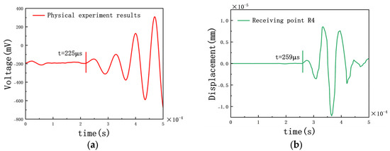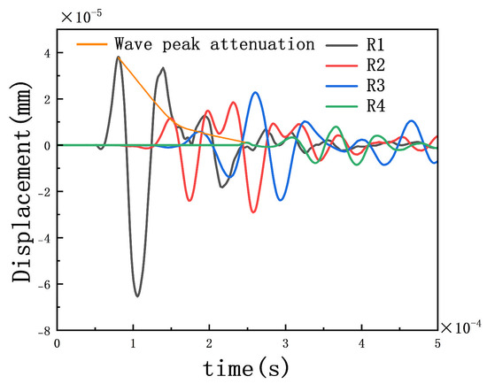 The propagation process of the shear wave from the excitation point T to the bottom receiving point R4 in the numerical test is observed when the excitation frequency is 20 kHz. The signals received at R1, R2, R3, and R4 are shown in Figure 4, reflecting the displacement of the particles along the x-direction at each receiving point. Figure 4 shows that each receiving point generates vibrations sequentially. The near-field effect gradually weakens with an increasing propagation distance at R1, R2, and R3 and is barely noticeable at R3. No near-field effect is observed anymore at the R4 receiver point. The severity of near-field effects is governed by the wavelength number, expressed as Rd = d/, where d represents the propagation distance and where = V/f denotes the wavelength (with V being the wave velocity and f the input signal frequency), yielding an Rd value of 3.3 in this case. The initial arrival time point of the excited shear wave at each receiving signal zero point was taken as the initial arrival time at different receiving points, followed by the first peak appearing as the initial arrival peak.