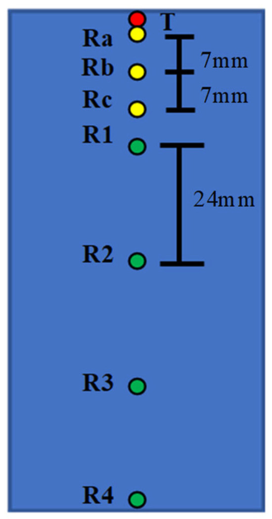 The shear wave dissipates the majority of its energy upon reaching R1. To observe the specific attenuation of the shear wave at R1, three additional receiving points, Ra, Rb, and Rc, were inserted at equal intervals between T and R1, as shown in Figure 6. The Ra receiving point is adjacent to the excitation point T, whereas the Rb and Rc receiving points are evenly located between Ra and R1. The response of the receiving point caused by the propagation of the shear wave from T to R1 is shown in Figure 7.