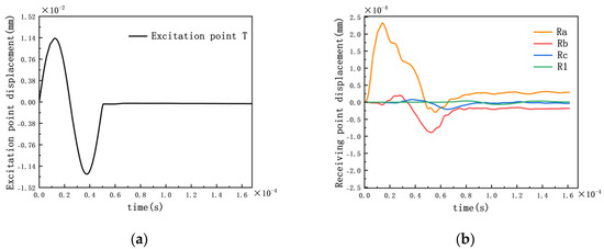 Comparison of the excitation signal and reception point signal: (a) excitation point T signal; (b) received signal of Ra to Rc.