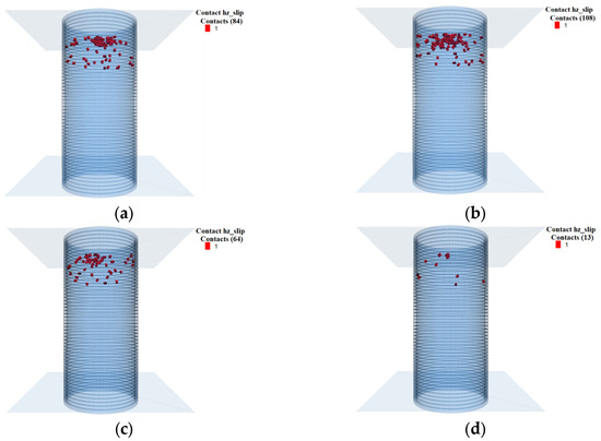 Evolution of the particle contact slip at 20 kHz: Contact slip at (a) 25 μs; (b) 50 μs; (c) 75 μs; (d) 100 μs.