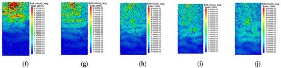 Evolution of the particle velocity field of the XZ cross-section: Particle velocity field at (a) 0 μs; (b) 25 μs; (c) 50 μs; (d) 75 μs; (e) 100 μs; (f) 125 μs; (g) 150 μs; (h) 175 μs; (i) 200 μs; (j) 225 μs.