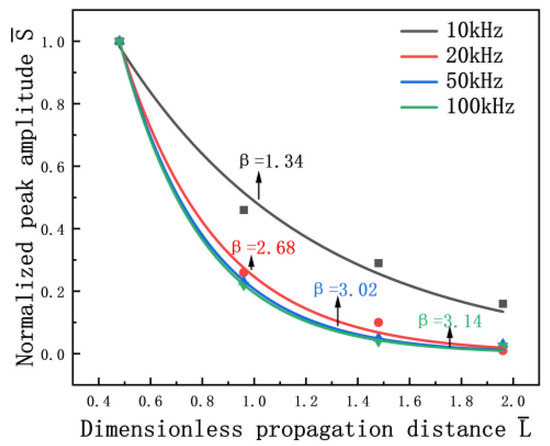Numerical experiments were conducted at different excitation frequencies, during which displacement data at reception points R1 through R4 were recorded. The peak displacement attenuation of the first-arrival wave at these reception points was subsequently fitted in accordance with Equation (1), as illustrated in Figure 11. The attenuation of shear waves progressively decreases with an increasing propagation distance across all the excitation frequencies. As the excitation frequency increased from 10 kHz to 100 kHz, the attenuation process between reception points R1 and R4 was observed to follow an exponential attenuation pattern, with the attenuation factor β increasing from 1.34 to 3.14. This indicates that an increase in the excitation frequency leads to a more pronounced attenuation of shear waves over the propagation distance. When the excitation frequency was below 20 kHz, the variation in the attenuation factor β increased significantly with an increasing excitation frequency. Among these, the attenuation process between reception points R1 and R2 was found to be the most sensitive to the increase in excitation frequency. When the excitation frequency exceeded 20 kHz, the effect of its increase on the variation amplitude of the attenuation factor β diminished, indicating a transition toward a stable critical state.