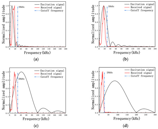 As illustrated in Figure 12, the frequency-domain representation of the sinusoidal peak is characterized by a dominant frequency band peak with a significant amplitude and a series of secondary peaks exhibiting progressively decreasing amplitudes. The amplitudes within the secondary frequency bands are observed to be substantially smaller than those within the dominant frequency band. The frequency corresponding to the dominant peak is identified as the excitation frequency, and the bandwidth of the dominant frequency band is twice the excitation frequency. The frequency band of the received signal is distributed within the frequency range of the excitation signal. At an excitation frequency of 10 kHz, nearly all frequency components were received almost entirely at reception point R4, with the peak amplitude occurring at approximately 17 kHz. As the excitation frequency increased, the frequency band range of the excitation point also expanded. However, the frequency components at the reception point were confined within a cutoff frequency, demonstrating a pronounced filtering effect. This finding indicates that only a portion of the frequency band from the excitation signal could be received at the reception point, and the amplitude contributions from frequency components exceeding the cutoff frequency were negligible compared with those at lower frequencies. Furthermore, higher excitation frequencies resulted in a broader frequency band range within the excitation signal, whereas the cutoff frequency remained unchanged. Consequently, the amplitudes of the receivable frequency components were observed to progressively decrease, and the filtering effect became increasingly significant.