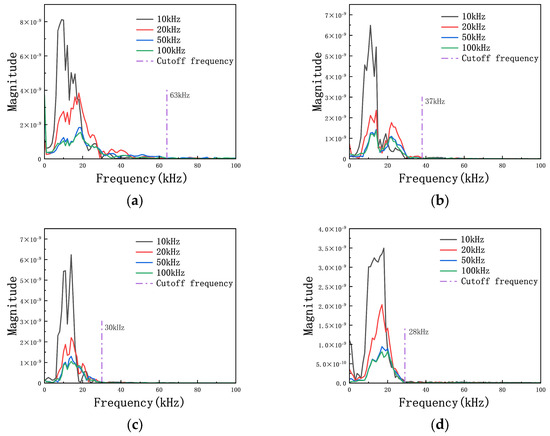 Frequency domains of the R4 signal: (a) 10 kHz; (b) 20 kHz; (c) 50 kHz; (d) 100 kHz.