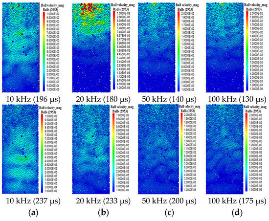 Effect of the excitation frequency on the velocity field evolution in different attenuation zones: (a) 10 kHz velocity field; (b) 20 kHz; (c) 50 kHz; (d) 100 kHz.