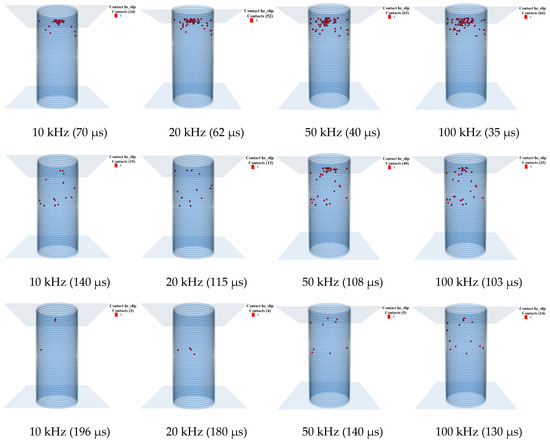 A comparison was conducted on the velocity field variations and contact slip conditions in the XZ cross-section near each reception point when the shear wave first arrived under excitation frequencies of 10 kHz, 20 kHz, 50 kHz, and 100 kHz, as illustrated in Figure 14 and Figure 15. This comparison provides a visual representation of the effects of frequency variations on the primary attenuation mechanisms of shear waves across different propagation segments.