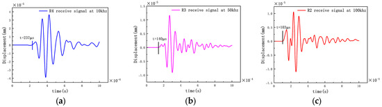 Time-domain signals at the receiving point when the near-field effect disappears at different frequencies: (a) R4 receiving signal at 10 kHz; (b) R3 receiving signal at 50 kHz; (c) R2 receiving signal at 100 kHz.