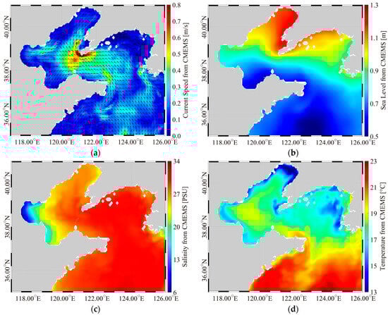 The CMEMS wind current vector maps on 20 October 2024 at 12:00 UTC: (a) sea surface current, (b) sea level, (c) salinity, and (d) sea surface temperature.