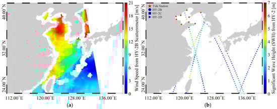 The HY-2B satellite, China’s first civilian mission equipped with a scatterometer and altimeter, was launched in 2018. In our prior study [], the performance of HY-2B data products—categorized into four processing levels: Operational Geophysical Data Records (OGDRs), Interim Geophysical Data Records (IGDRs), Sensor Geophysical Data Records (SGDRs), and Geophysical Data Records (GDRs)—was systematically evaluated. Results demonstrated that the GDR products exhibited superior accuracy. Since 2021, HY-2B’s successor satellites, HY-2C and HY-2D, have been successively launched and operationalized, forming a constellation to enhance oceanographic monitoring. To validate hindcasted wind and wave parameters, non-interpolated operational scatterometer and altimeter data from the HY-2(2B/2C/2D) satellites were obtained from the National Satellite Ocean Application Center (accessible via https://osdds.nsoas.org.cn, accessed on 3 June 2025). HY-2 altimeter and scatterometer products achieve high precision through rigorous processing, including precise orbit determination, instrument calibration, geophysical model integration, and ground validation. Additionally, hourly sea level observations from tide gauge stations along the Chinese coast, provided by the National Marine Information Center and subjected to quality control and analytical processing, were utilized to validate hindcasted sea levels. Figure 3a depicts the HY-2B scatterometer-derived wind speed field at 09:00 UTC on 19 October 2024, while Figure 3b illustrates the concurrent SWH distribution from the HY-2 altimeter. Red five-pointed stars denote the geographical locations of the tide gauge stations used in this study.