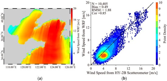 Wind field analysis for 19 October 2024 at 09:00 UTC: (a) WRF-simulated wind field and (b) validation against HY-2B/C/D scatterometer measurements.