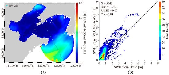 SWH validation on 26 October 2024 at 00:00 UTC: (a) modeled SWH field from FVCOM-SWAVE with triangular markers indicating coincident HY-2 altimeter measurements and (b) comparison between FVCOM-SWAVE simulations and HY-2 altimeter observations.