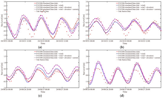 Model–observation comparison of sea level simulations under different forcing configurations: (a) tide, (b) wind + tide forcing, (c) wind + tide + elevation forcing, and (d) wind + tide + elevation + current forcing.