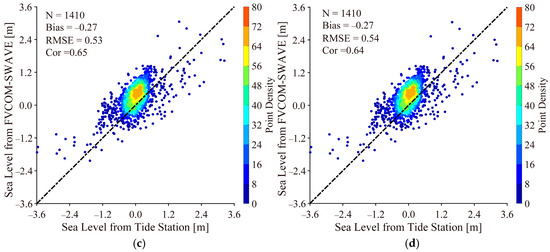 Figure 6 presents the time series validation between FVCOM-SWAVE-simulated sea levels and tide gauge observations. The results demonstrate that simulations incorporating wind, tide, and elevation forcing fields effectively reproduce observed high sea level conditions. Conversely, simulations with tidal forcing alone accurately capture low sea level variations, particularly at the tide station located at (117.79° E, 38.97° N) (Figure 6a). The comparison of different forcing configurations reveals that elevation and wind are key drivers of water level variability in the study area, while tidal forcing represents the fundamental mechanism governing sea level changes. Notably, currents appear to have negligible influence on sea level variations. Quantitative validation against tide gauge data (Figure 7) shows optimal model performance when considering only tidal effects, yielding an RMSE of 0.43 m and a Cor of 0.70. All four sensitivity experiments maintained RMSE values below 0.70 m, demonstrating consistent model performance across different forcing configurations. These results confirm the reliability of the model for future applications in the study region.