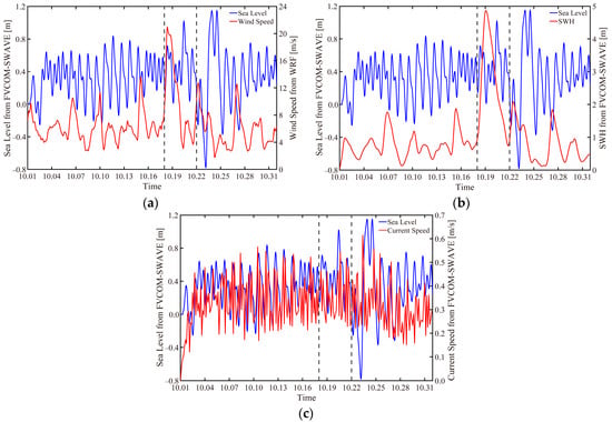 Time series of sea surface parameters in the Bohai Sea on 1–31 October 2024: (a) wind speed, (b) SWH, and (c) imposed boundary current speed. The dash lines represent the occurrence of sea level rapid rise.