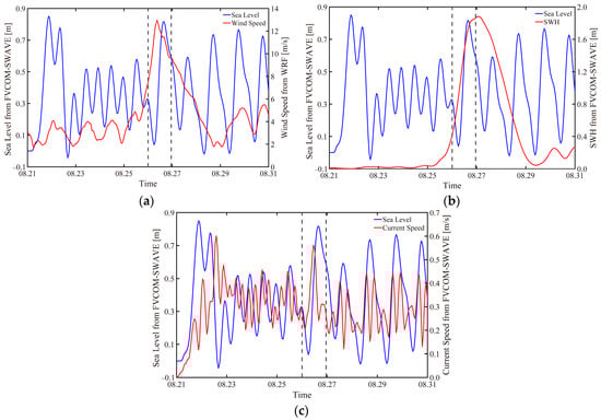 Time series of sea surface parameters in the Bohai Sea on 21–31 August 2024: (a) wind speed, (b) SWH, and (c) imposed boundary current speed. The dash lines represent the occurrence of sea level rapid rise.