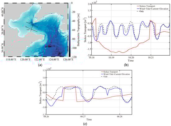 Stokes transport along the transect marked in Figure 11a (black line) was computed using wave parameters simulated by the FVCOM-SWAVE model. Figure 13a provides a schematic representation of cross-regional transport dynamics between the Bohai and Yellow Seas, where net inflow into the Bohai Sea is defined as positive. Figure 13b compares the time series of net transport under three distinct forcing configurations during October 2024: (1) tide-only, (2) combined wind, tide, current, and elevation boundary conditions, and (3) wave-induced Stokes transport. Similarly, Figure 13c shows the time series of net transport under three distinct forcing configurations in August 2024. The analysis demonstrates that tidal forcing dominates the net water flux into the Bohai Sea. However, Stokes transport contributions on 21 October 2024 and 26 August 2024 exhibit a pronounced secondary influence, amplifying sea level rise during this period. These results underscore the primacy of tidal dynamics in governing Bohai Sea hydrodynamics, with wave-induced Stokes transport providing secondary but non-negligible contributions to water level variability. The temporal decoupling between hydrodynamic forcing and sea level response highlights the cumulative contribution of wave-induced Stokes drift to coastal water accumulation.