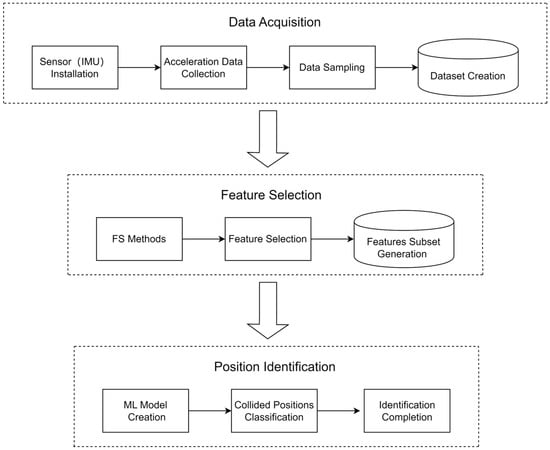 Figure 1 shows a process flowchart of the ML-based identification of collided positions. It consists of three processes: the first process is to acquire data using the IMU sensor, the second process is to find the most helpful feature subset for detecting collided positions, and the final process is to use ML to identify collided positions.