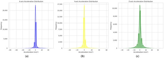 Table 2 and Figure 5 further reveal that the value ranges (minimum to maximum) of the horizontal accelerations (X and Y axes) are notably larger (e.g., X axis: −77.2~50.0 m/s2), indicating drastic acceleration changes during horizontal collisions. In contrast, the Z axis (vertical acceleration) has a similarly near-zero mean but a narrower value range (−32.4~35.4 m/s2), suggesting that vertical collisions involve smaller instantaneous vibration amplitudes and correspondingly milder acceleration fluctuations. These findings highlight the distinct physical characteristics of IMU-measured accelerations during horizontal vs. vertical collisions, with the horizontal direction, on the other hand, showing a more pronounced change in dynamics.