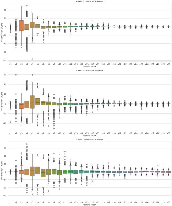 To facilitate our understanding of the data characteristics, statistical analysis was performed on the experimental data. The dataset includes 661 collision event samples, with each sample forming a 90-dimensional feature vector by intercepting 30 consecutive three-axis accelerations (X, Y, Z axes) from the IMU sensor’s raw data sampled at 100 Hz. Table 1 presents descriptive statistics, including the mean, standard deviation, distribution patterns, and value ranges (min-max). Figure 1 and Figure 2 display the XYZ three-axis acceleration distribution histograms and feature-wise boxplots, respectively, to assist in interpreting the statistical results.