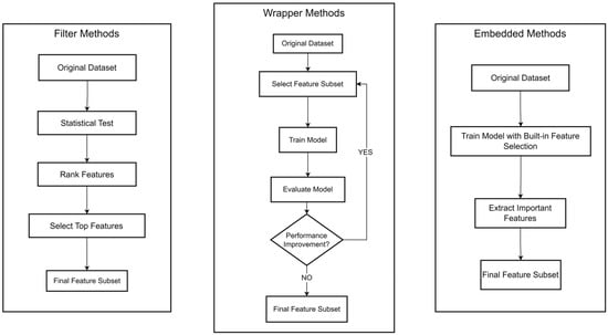 Figure 6 illustrates typical workflows for three main categories of FS methods: filter, wrapper, and embedded. Filter methods generally involve computing statistical measures or correlations for all features and then ranking and selecting the top-scoring subset. For instance, this study adopts PCC and MI; PCC evaluates the linear correlation between variables, whereas MI measures the amount of shared information from an information-theoretical perspective, emphasizing how strongly a feature and the target depend on each other.