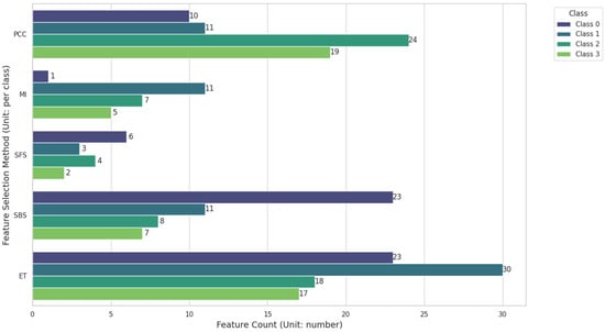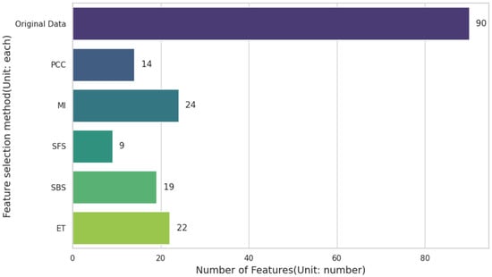 Based on the principle of the FS method shown in Figure 6, to select the optimal subset of features, this study sets the parameter settings for each FS method as follows: The filtering threshold of PCC and MI is set to 0.2, based on the analysis in Appendix A.1, to avoid too much degradation of model performance and the appearance of empty sets in feature subsets. As the classifier model for SFS and SBS, we utilized the Gaussian Naive Bayes (GaussianNB) model [], using accuracy as the performance metric for evaluating model subsets. This choice was made due to its low computational resource requirements, aligning with our goal of minimizing computational costs. We configured the parameters for ET using the default initialization settings in the sklearn library to avoid unnecessary complexity. Before performing FS operations and implementing the ML model for classification, the dataset was standardized to eliminate the impact of different feature dimensions. This standardization helps ensure that the subsequent FS methods and ML model calculations are more effective, and it can also accelerate the convergence of the model during training.