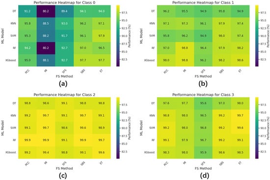 Figure 9 shows the accuracy heat map for the four classes. The vertical axis represents the ML model, and the horizontal axis represents the FS method. Each number is the accuracy of the corresponding combination; the closer the color is to yellow, the higher the accuracy, and the closer the color is to blue, the lower the accuracy. We see that the overall color for Class 2 is closest to yellow, followed by Class 3 and Class 1. In contrast, Class 0 shows that the overall color is closest to dark green. This indicates that all combinations for Class 0 exhibit relatively poor performance. According to Table 5, the combination with the worst classification performance for Class 0 is DT and MI, with an accuracy of 80.2%, while the worst performances for Class 1, Class 2, and Class 3 do not fall below an accuracy of 94.0%.