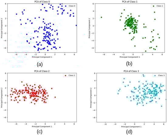 Figure 10 shows the distribution of the data for the four class systems after applying two-dimensional Principal Component Analysis (PCA) []. We found that the data distribution for Class 0 is not particularly concentrated compared with the other classes, which is the reason why the classification performance of Class 0 is poor. Collisions at different positions will produce different distributions of data. During data collection, collisions were conducted at different positions on the container. When collisions occurred, the container usually underwent a slight offset along the direction of the collision, so the data generated will be distributed more concentratedly along the collision direction, making it easier for the ML model to identify and classify. For example, in Figure 10, Class 2 and Class 3 represent the data distributions for the left and right positions, respectively. Their data distributions are relatively concentrated. Class 2, even for the worst combination of DT and MI, achieved an accuracy 98.6%, while for the best combination of RF and PCC, it achieved an accuracy 99.9%.