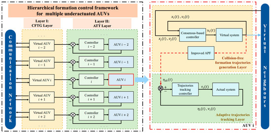 The architecture of the hierarchical framework for multiple underactuated AUVs’ formation control is depicted in Figure 2. Compared with the current AUVs’ formation control methods, the hierarchical framework does not calculate formation errors and send it to AUVs’ individual controller directly as a swarm reference signal. Instead, the proposed architecture systematically decouples the formation maintenance objectives and individual AUV dynamics control through a dual-layer structure comprising: the Collision-free Formation Trajectories Generation Layer (CFTG Layer) and the Adaptive Trajectories Tracking Layer (ATT Layer).