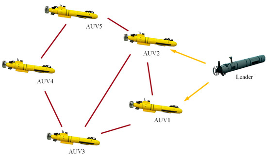 As underwater technology advances, AUVs (autonomous underwater vehicles) have become crucial in various underwater operations. Despite their low cost and low-risk benefits, single AUVs’ payload limits restrict their efficiency and flexibility. Multi-AUV cooperation, however, offers more possibilities. In fields like ocean exploration, multi-AUV systems can efficiently cover large areas for tasks such as seafloor mapping and resource survey. In marine rescue operations, they can quickly locate and assist in rescuing distressed vessels or crew members [1]. They are also applicable in marine environmental monitoring for data collection on water quality and ecosystem health [2]. Nowadays, AUV formation control, a key technology in multi-AUV collaboration, has drawn considerable attention. Existing methods include leader–follower, behavioral-based, bearing-based, dynamic surface control, graph theory, and artificial potential field approaches [3,4,5,6,7,8].
