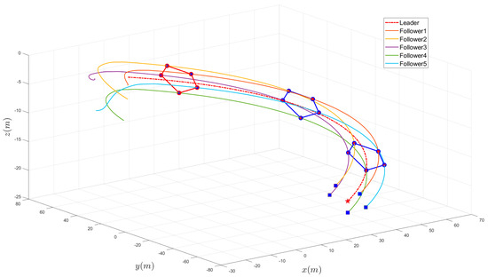 Based on Lemma 1 and the parameters mentioned above, one can easily calculate that the settling time of the formation task is , which means all the followers can generate the desired trajectories according to the formation vector and track their desired trajectories within the settling time . Figure 5 depicts the three-dimensional time-varying trajectories of six AUVs without obstacles. The five blue circles surrounding by the red pentagon denote the positions of the followers at settling time . The red star represents the final position of the leader AUV and five bule squares represent the final positions of five follower AUVs. As shown in Figure 4, the formation is completed before , and the formation can be maintained till the end of the mission. The result shows that, under the hierarchical framework and designed controllers, AUVs can complete the formation task well within a fixed time.