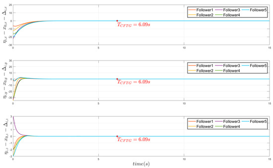 Consider the leader–follower multiple virtual AUVs (12) under controller (16). The virtual AUVs (12) can reach consensus and maintain formation within a fixed time. Thus, the CFTG Layer is capable of calculating virtual states and generating reference trajectories for AUVs within a fixed time.