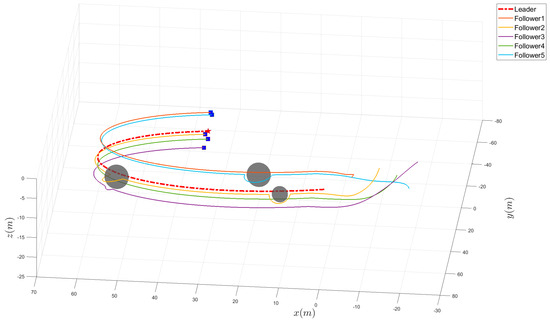 Figure 7 depicts the three-dimensional time-varying trajectories of six AUVs with obstacles. Three obstacles are represented by gray spheres. In Figure 7, follower 2, follower 3, and follower 5 are influenced by the three obstacles. Under the improved artificial potential field methods, it ensures that the AUVs will not collide with obstacles near them and can immediately return to the formation after exiting the danger zone. The result shows that, based on our proposed methods, AUVs can achieve collision-free formation.