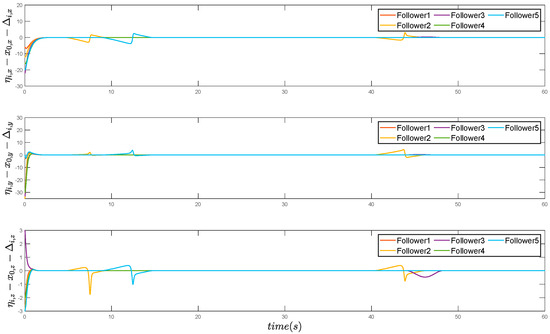 In Figure 8, the obstacle avoidance situation of AUVs is more evident when encountering obstacles. The three fluctuations in Figure 8 represent the follower 2, follower 3, and follower 5 are sailing near obstacles. At this point, under the improved APF algorithm, these AUVs temporarily deviate from the formation to avoid obstacles. After these AUVs move away from the obstacles, the formation error decreases to zero rapidly, indicating that the formation is reconstructed quickly.